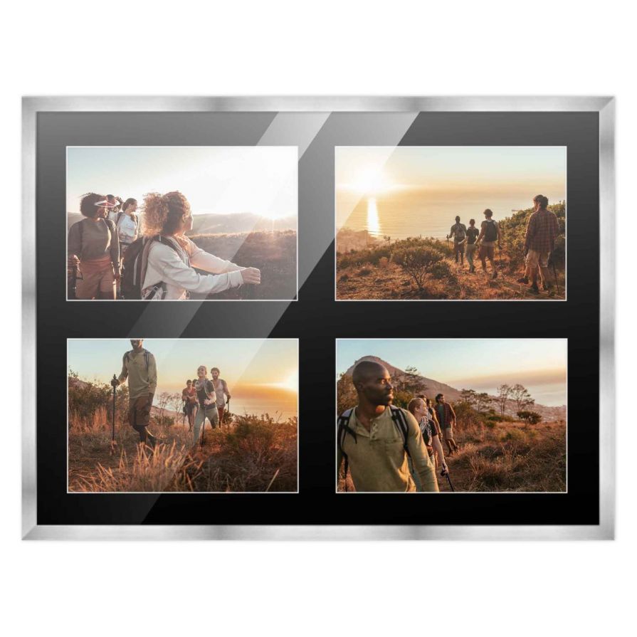 This wood picture frame is available in black, white, gold, silver, natural and dark wood finishes and is perfect for your cherished memories, like a wedding, vacation or birthday. This acid-free mat features 4 openings for 4x6 inch pictures. Pick a black or white acid-free mat to complete your 4 picture collage frame. Included with this collage frame and photo mat is UV acrylic, acid-free backing and hanging hardware for hassle-free displaying!