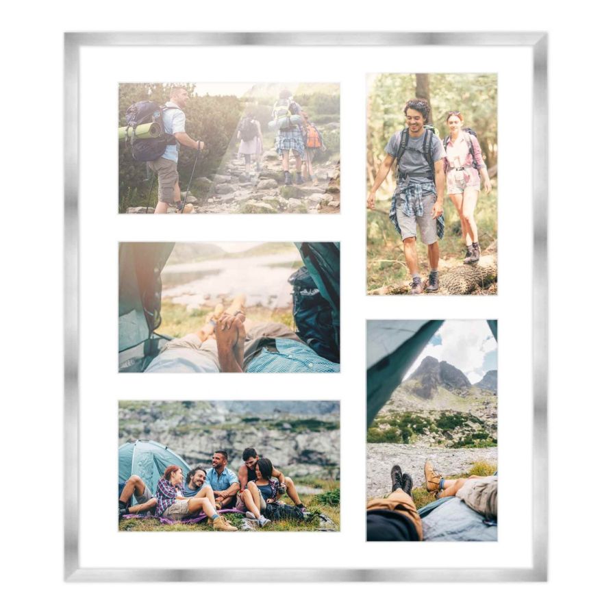 This wood picture frame is available in black, white, gold, silver, natural and dark wood finishes and is perfect for your cherished memories, like a wedding, vacation or birthday. This acid-free mat features 5 openings for 5x7 inch pictures. Pick a black or white acid-free mat to complete your 5 picture collage frame. Included with this collage frame and photo mat is UV acrylic, acid-free backing and hanging hardware for hassle-free displaying!