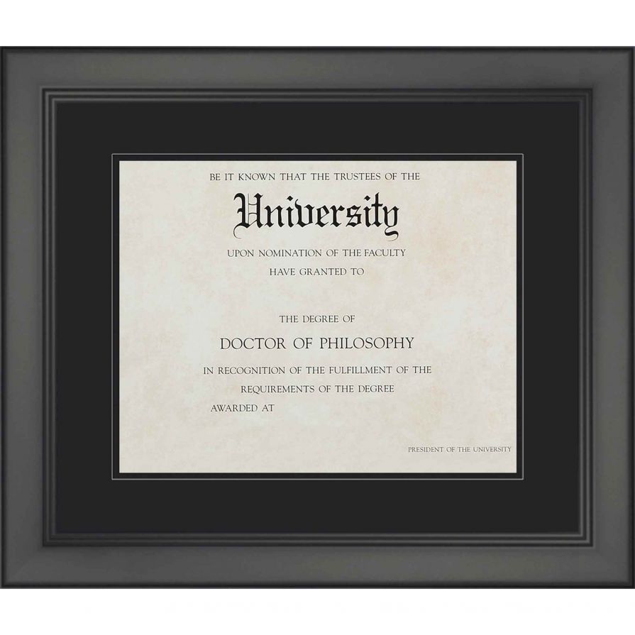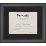 This frame features a black finish and black on black acid-free double mat and includes a UV resistant acrylic protective front, foam board backing and wall hanging hardware. We offer a variety of custom frames that fit a diploma, degree or certificate measuring: 8.5x11, 11x14, 7.5x9.5, 12x15 and 11.75x16 with the mats or 11x14, 15x18, 11.5x13.5, 16x19 and 15.75x20 without the mats.