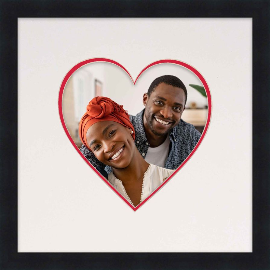 It has a real wood frame and acid-free mat and is high-quality and perfect for adding a personal touch. Choose from our most popular frame styles. You can customize your heart frame to feature a black, white, red, rose gold or rustic white finish. Then, choose your mat options. Opt for a single white mat, or add a pop of color with a double mat with a 1/4" reveal in your choice of white, red or pink!
