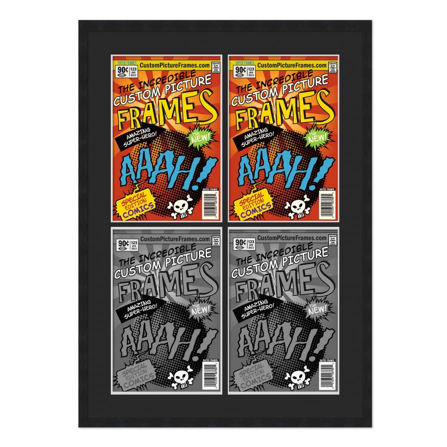 Share your comic collection by putting your comic books on display in a high-quality wood frame. Includes nesting foam to snuggly and securely hold your comic books in place. This frame features a black finish and your choice of black or white acid-free matting to display 4 comic books in a 2x2 grid collage. Also included are a UV-resistant acrylic protective front, foam board backing, easel stand, and wall hanging hardware. This frame displays four Bronze Age (Published Between 1970 and 1985) comic books measuring 7.25x10.5 inches, Golden Age (Published Between 1938 and 1956) comic books measuring 7.75x10.5 inches, Silver Age (Published Between 1956 and 1970) comic books measuring 7.125x10.5 inches or Current Era (Published After 1985) comic books measuring 6.875x10.5 inches. This moulding is 0.75 inches wide. The overall dimensions of this frame are 21.5x27 inches. Includes nesting foam to snuggly and securely hold your comic books in place. This comic book frame for your Bronze, Golden, Silver or Current comic books makes a great gift or addition to your home or office! Display your prized comic book collection in style with a handcrafted frame by Custom Picture Frames.