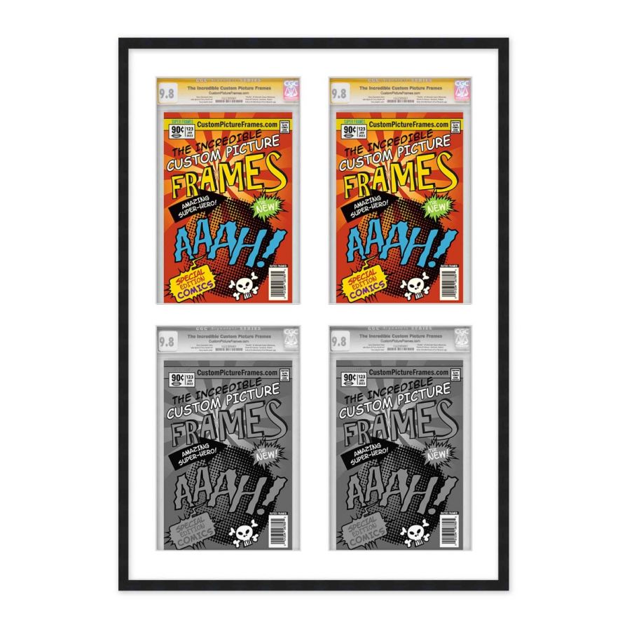 Share your comic collection by putting your comic books on display in a high-quality wood frame. Includes nesting foam to snuggly and securely hold your comic books in place. This frame features a black finish and your choice of black or white acid-free matting to display 4 graded comic books in a 2x2 grid collage. Also included are a UV-resistant acrylic protective front, foam board backing, easel stand, and wall hanging hardware. This frame displays four CGC, CBCS or PGX graded comic books measuring 8.125x13 inches. This moulding is 0.75 inches wide. The overall dimensions of this frame are 22.25x32 inches. Includes nesting foam to snuggly and securely hold your comic books in place. This graded comic book frame for your CGC, CBCS or PGX graded comic books makes a great gift or addition to your home or office! Display your prized comic book collection in style with a handcrafted frame by Custom Picture Frames.