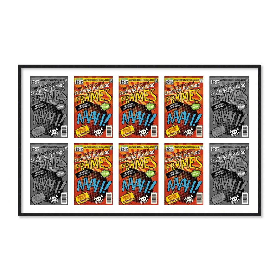 Share your comic collection by putting your comic books on display in a high-quality wood frame. Includes nesting foam to snuggly and securely hold your comic books in place. This frame features a black finish and your choice of black or white acid-free matting to display 10 comic books horizontally. Also included are a UV-resistant acrylic protective front, foam board backing, easel stand, and wall hanging hardware. This frame displays ten Bronze Age (Published Between 1970 and 1985) comic books measuring 7.25x10.5 inches, Golden Age (Published Between 1938 and 1956) comic books measuring 7.75x10.5 inches, Silver Age (Published Between 1956 and 1970) comic books measuring 7.125x10.5 inches or Current Era (Published After 1985) comic books measuring 6.875x10.5 inches. This moulding is 0.75 inches wide. The overall dimensions of this frame are 45.5x26.25 inches. Includes nesting foam to snuggly and securely hold your comic books in place. This comic book frame for your Bronze, Golden, Silver or Current comic books makes a great gift or addition to your home or office! Display your prized comic book collection in style with a handcrafted frame by Custom Picture Frames.