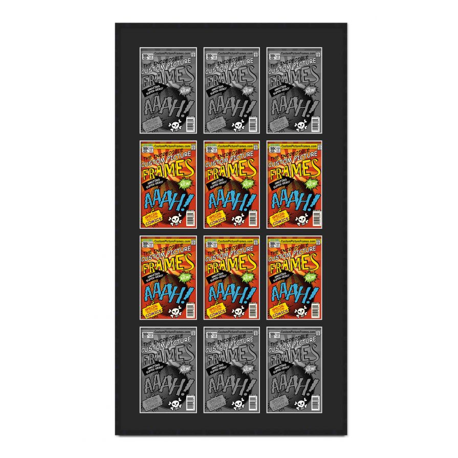 Share your comic collection by putting your comic books on display in a high-quality wood frame. Includes nesting foam to snuggly and securely hold your comic books in place. This frame features a black finish and your choice of black or white acid-free matting to display 12 comic books. Also included are a UV-resistant acrylic protective front, foam board backing, easel stand, and wall hanging hardware. This frame displays twelve Bronze Age (Published Between 1970 and 1985) comic books measuring 7.25x10.5 inches, Golden Age (Published Between 1938 and 1956) comic books measuring 7.75x10.5 inches, Silver Age (Published Between 1956 and 1970) comic books measuring 7.125x10.5 inches or Current Era (Published After 1985) comic books measuring 6.875x10.5 inches. This moulding is 0.75 inches wide. The overall dimensions of this frame are 30.5x52 inches. Includes nesting foam to snuggly and securely hold your comic books in place. This comic book frame for your Bronze, Golden, Silver or Current comic books makes a great gift or addition to your home or office! Display your prized comic book collection in style with a handcrafted frame by Custom Picture Frames.