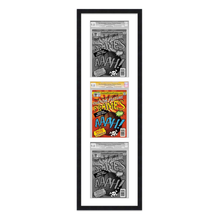 Share your comic collection by putting your comic books on display in a high-quality wood frame. Includes nesting foam to snuggly and securely hold your comic books in place. This frame features a black finish and your choice of black or white acid-free matting to display 3 comic books vertically. Also included are a UV-resistant acrylic protective front, foam board backing, easel stand, and wall hanging hardware. This frame displays three Bronze Age (Published Between 1970 and 1985) comic books measuring 7.25x10.5 inches, Golden Age (Published Between 1938 and 1956) comic books measuring 7.75x10.5 inches, Silver Age (Published Between 1956 and 1970) comic books measuring 7.125x10.5 inches or Current Era (Published After 1985) comic books measuring 6.875x10.5 inches. This moulding is 0.75 inches wide. The overall dimensions of this frame are 12.75x37.5 inches. Includes nesting foam to snuggly and securely hold your comic books in place. This triple comic book frame for your Bronze, Golden, Silver or Current comic books makes a great gift or addition to your home or office! Display your prized comic book collection in style with a handcrafted frame by Custom Picture Frames.