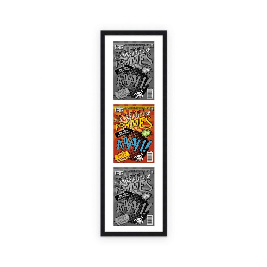 Share your comic collection by putting your comic books on display in a high-quality wood frame. Includes nesting foam to snuggly and securely hold your comic books in place. This frame features a black finish and your choice of black or white acid-free matting to display 3 comic books vertically. Also included are a UV-resistant acrylic protective front, foam board backing, easel stand, and wall hanging hardware. This frame displays three Bronze Age (Published Between 1970 and 1985) comic books measuring 7.25x10.5 inches, Golden Age (Published Between 1938 and 1956) comic books measuring 7.75x10.5 inches, Silver Age (Published Between 1956 and 1970) comic books measuring 7.125x10.5 inches or Current Era (Published After 1985) comic books measuring 6.875x10.5 inches. This moulding is 0.75 inches wide. The overall dimensions of this frame are 12.75x37.5 inches. Includes nesting foam to snuggly and securely hold your comic books in place. This triple comic book frame for your Bronze, Golden, Silver or Current comic books makes a great gift or addition to your home or office! Display your prized comic book collection in style with a handcrafted frame by Custom Picture Frames.