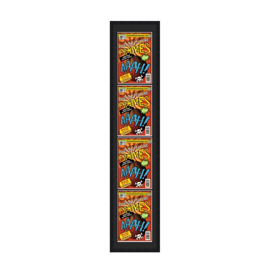 Share your comic collection by putting your comic books on display in a high-quality wood frame. Includes nesting foam to snuggly and securely hold your comic books in place. This frame features a black finish and your choice of black or white acid-free matting to display 4 comic books vertically. Also included are a UV-resistant acrylic protective front, foam board backing, easel stand, and wall hanging hardware. This frame displays four Bronze Age (Published Between 1970 and 1985) comic books measuring 7.25x10.5 inches, Golden Age (Published Between 1938 and 1956) comic books measuring 7.75x10.5 inches, Silver Age (Published Between 1956 and 1970) comic books measuring 7.125x10.5 inches or Current Era (Published After 1985) comic books measuring 6.875x10.5 inches. This moulding is 0.75 inches wide. The overall dimensions of this frame are 12.75x48.5 inches. Includes nesting foam to snuggly and securely hold your comic books in place. This comic book frame for your Bronze, Golden, Silver or Current comic books makes a great gift or addition to your home or office! Display your prized comic book collection in style with a handcrafted frame by Custom Picture Frames.