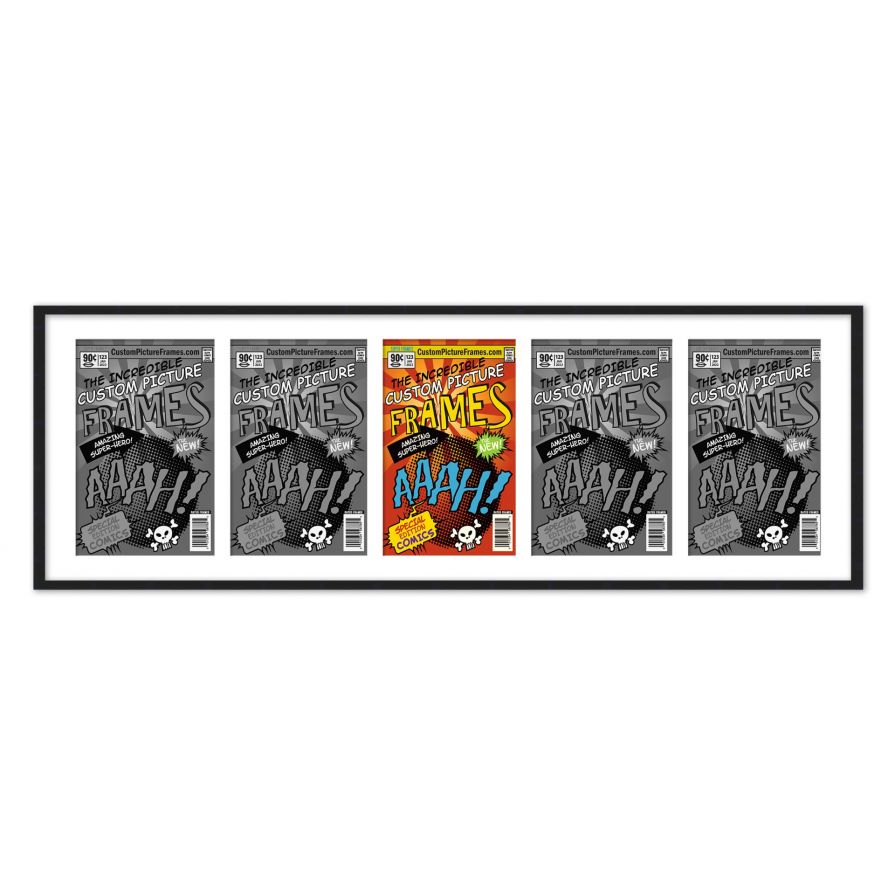 Share your comic collection by putting your comic books on display in a high-quality wood frame. Includes nesting foam to snuggly and securely hold your comic books in place. This frame features a black finish and your choice of black or white acid-free matting to display 5 comic books. Also included are a UV-resistant acrylic protective front, foam board backing, easel stand, and wall hanging hardware. This frame displays five Bronze Age (Published Between 1970 and 1985) comic books measuring 7.25x10.5 inches, Golden Age (Published Between 1938 and 1956) comic books measuring 7.75x10.5 inches, Silver Age (Published Between 1956 and 1970) comic books measuring 7.125x10.5 inches or Current Era (Published After 1985) comic books measuring 6.875x10.5 inches. This moulding is 0.75 inches wide. The overall dimensions of this frame are 45.5x15.5 inches. Includes nesting foam to snuggly and securely hold your comic books in place. This comic book frame for your Bronze, Golden, Silver or Current comic books makes a great gift or addition to your home or office! Display your prized comic book collection in style with a handcrafted frame by Custom Picture Frames.