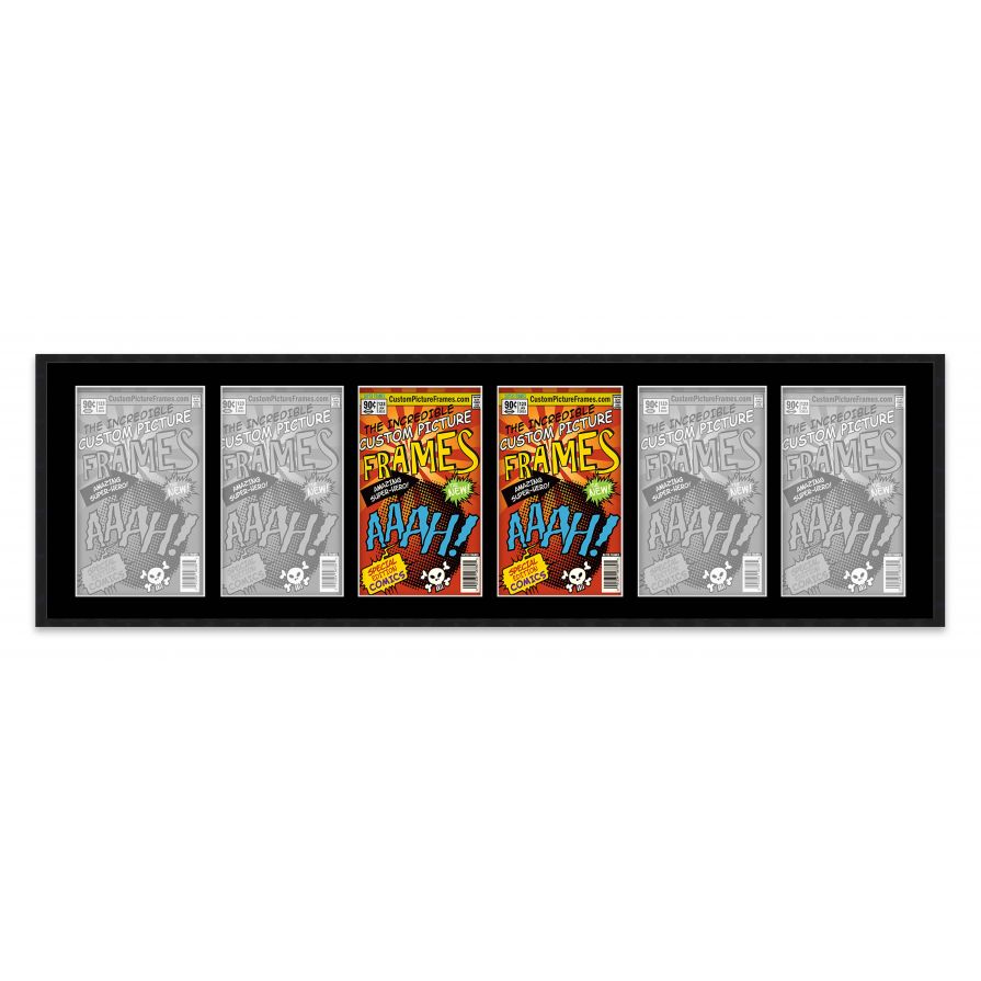 Share your comic collection by putting your comic books on display in a high-quality wood frame. Includes nesting foam to snuggly and securely hold your comic books in place. This frame features a black finish and your choice of black or white acid-free matting to display 6 comic books. Also included are a UV-resistant acrylic protective front, foam board backing, easel stand, and wall hanging hardware. This frame displays six Bronze Age (Published Between 1970 and 1985) comic books measuring 7.25x10.5 inches, Golden Age (Published Between 1938 and 1956) comic books measuring 7.75x10.5 inches, Silver Age (Published Between 1956 and 1970) comic books measuring 7.125x10.5 inches or Current Era (Published After 1985) comic books measuring 6.875x10.5 inches. This moulding is 0.75 inches wide. The overall dimensions of this frame are 52.5x15.5 inches. Includes nesting foam to snuggly and securely hold your comic books in place. This comic book frame for your Bronze, Golden, Silver or Current comic books makes a great gift or addition to your home or office! Display your prized comic book collection in style with a handcrafted frame by Custom Picture Frames.