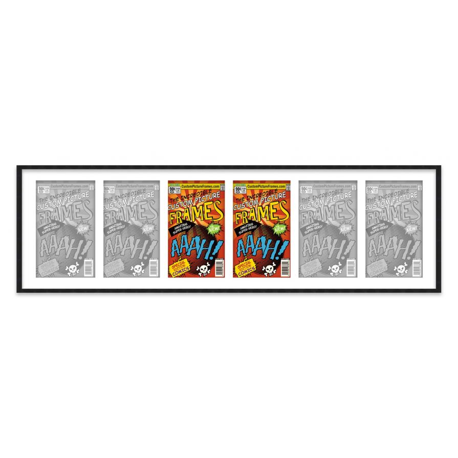 Share your comic collection by putting your comic books on display in a high-quality wood frame. Includes nesting foam to snuggly and securely hold your comic books in place. This frame features a black finish and your choice of black or white acid-free matting to display 6 comic books. Also included are a UV-resistant acrylic protective front, foam board backing, easel stand, and wall hanging hardware. This frame displays six Bronze Age (Published Between 1970 and 1985) comic books measuring 7.25x10.5 inches, Golden Age (Published Between 1938 and 1956) comic books measuring 7.75x10.5 inches, Silver Age (Published Between 1956 and 1970) comic books measuring 7.125x10.5 inches or Current Era (Published After 1985) comic books measuring 6.875x10.5 inches. This moulding is 0.75 inches wide. The overall dimensions of this frame are 52.5x15.5 inches. Includes nesting foam to snuggly and securely hold your comic books in place. This comic book frame for your Bronze, Golden, Silver or Current comic books makes a great gift or addition to your home or office! Display your prized comic book collection in style with a handcrafted frame by Custom Picture Frames.