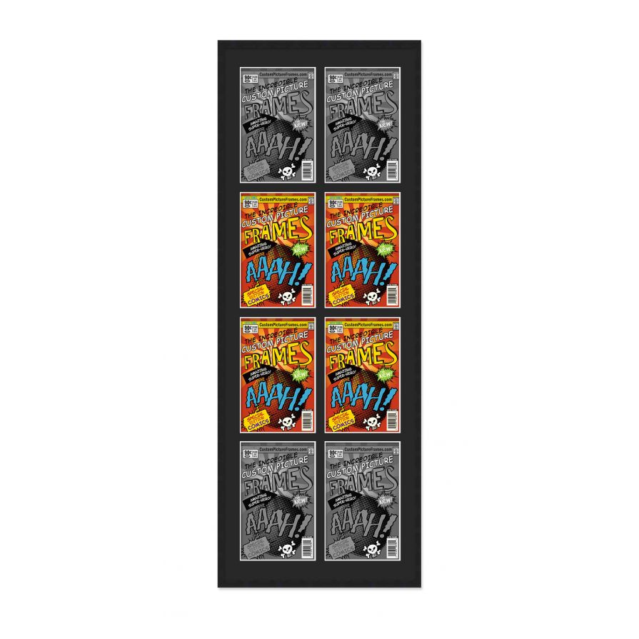 Share your comic collection by putting your comic books on display in a high-quality wood frame. Includes nesting foam to snuggly and securely hold your comic books in place. This frame features a black finish and your choice of black or white acid-free matting to display 8 comic books vertically. Also included are a UV-resistant acrylic protective front, foam board backing, easel stand, and wall hanging hardware. This frame displays eight Bronze Age (Published Between 1970 and 1985) comic books measuring 7.25x10.5 inches, Golden Age (Published Between 1938 and 1956) comic books measuring 7.75x10.5 inches, Silver Age (Published Between 1956 and 1970) comic books measuring 7.125x10.5 inches or Current Era (Published After 1985) comic books measuring 6.875x10.5 inches. This moulding is 0.75 inches wide. The overall dimensions of this frame are 21.5x52 inches. Includes nesting foam to snuggly and securely hold your comic books in place. This comic book frame for your Bronze, Golden, Silver or Current comic books makes a great gift or addition to your home or office! Display your prized comic book collection in style with a handcrafted frame by Custom Picture Frames.