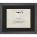 This frame features a black finish and black on gold acid-free double mat and includes a UV resistant acrylic protective front, foam board backing and wall hanging hardware. We offer a variety of custom frames that fit a diploma, degree or certificate measuring: 8.5x11, 11x14, 7.5x9.5, 12x15 and 11.75x16 with the mats or 11x14, 15x18, 11.5x13.5, 16x19 and 15.75x20 without the mats.