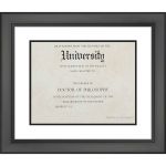 This frame features a black finish and white on black acid-free double mat and includes a UV resistant acrylic protective front, foam board backing and wall hanging hardware. We offer a variety of custom frames that fit a diploma, degree or certificate measuring: 8.5x11, 11x14, 7.5x9.5, 12x15 and 11.75x16 with the mats or 11x14, 15x18, 11.5x13.5, 16x19 and 15.75x20 without the mats.