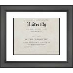This frame features a black finish and white on black acid-free double mat and includes a UV resistant acrylic protective front, foam board backing and wall hanging hardware. We offer a variety of custom frames that fit a diploma, degree or certificate measuring: 8.5x11, 11x14, 7.5x9.5, 12x15 and 11.75x16 with the mats or 11x14, 15x18, 11.5x13.5, 16x19 and 15.75x20 without the mats.