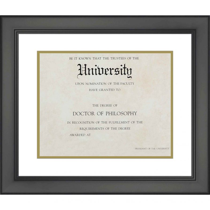 This frame features a black finish and white on gold acid-free double mat and includes a UV resistant acrylic protective front, foam board backing and wall hanging hardware. We offer a variety of custom frames that fit a diploma, degree or certificate measuring: 8.5x11, 11x14, 7.5x9.5, 12x15 and 11.75x16 with the mats or 11x14, 15x18, 11.5x13.5, 16x19 and 15.75x20 without the mats.