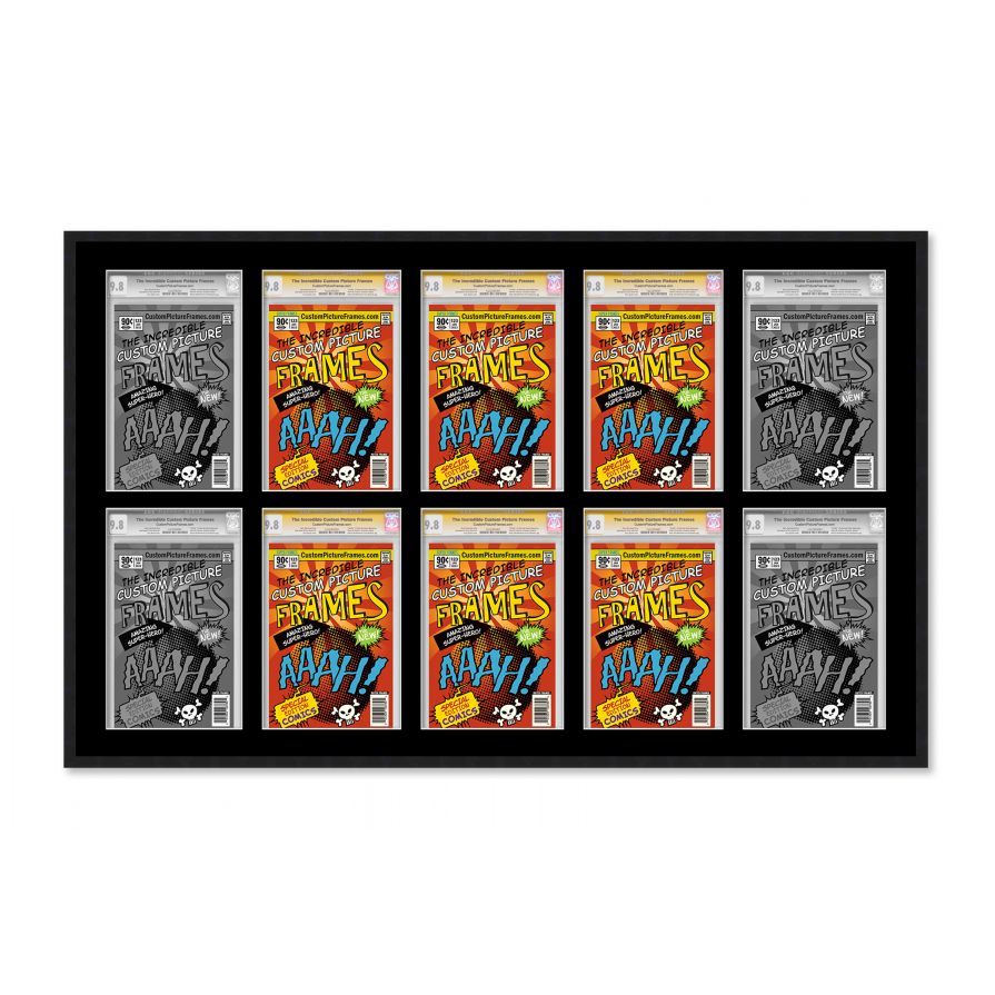 Share your comic collection by putting your comic books on display in a high-quality wood frame. Includes nesting foam to snuggly and securely hold your comic books in place. This frame features a black finish and your choice of black or white acid-free matting to display 10 graded comic books horizontally. Also included are a UV-resistant acrylic protective front, foam board backing, easel stand, and wall hanging hardware. This frame displays ten CGC, CBCS or PGX graded comic books measuring 8.125x13 inches. This moulding is 0.75 inches wide. The overall dimensions of this frame are 45.5x29.75 inches. Includes nesting foam to snuggly and securely hold your comic books in place. This graded comic book frame for your CGC, CBCS or PGX graded comic books makes a great gift or addition to your home or office! Display your prized comic book collection in style with a handcrafted frame by Custom Picture Frames.