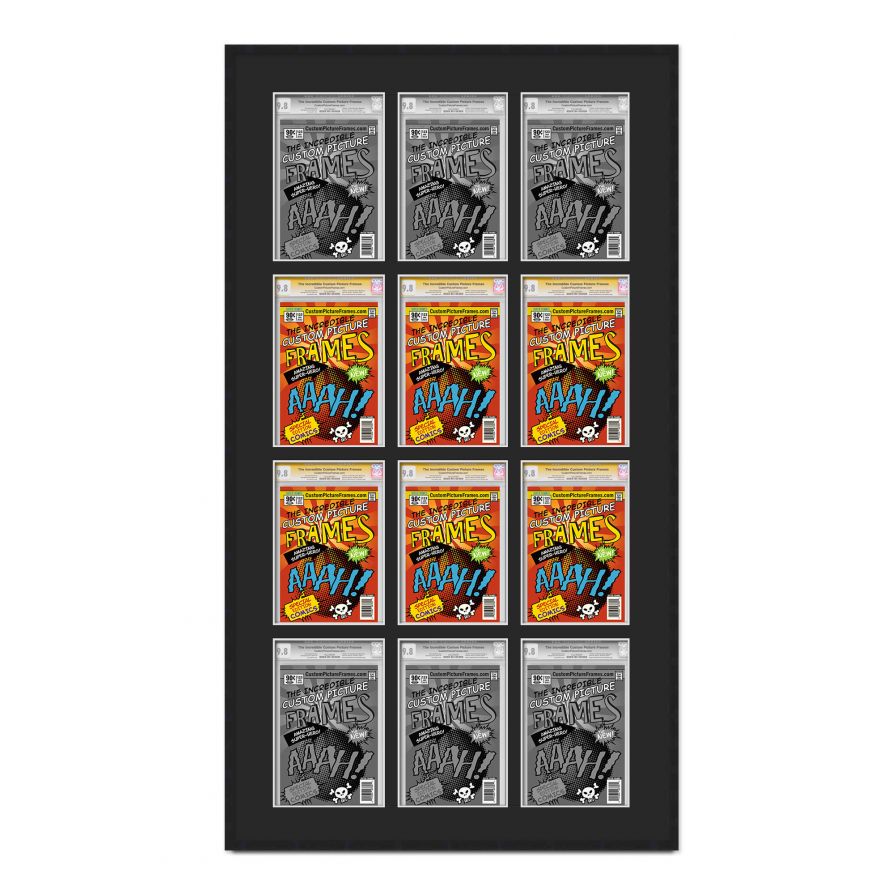 Share your comic collection by putting your comic books on display in a high-quality wood frame. Includes nesting foam to snuggly and securely hold your comic books in place. This frame features a black finish and your choice of black or white acid-free matting to display 12 graded comic books. Also included are a UV-resistant acrylic protective front, foam board backing, easel stand, and wall hanging hardware. This frame displays twelve CGC, CBCS or PGX graded comic books measuring 8.125x13 inches. This moulding is 0.75 inches wide. The overall dimensions of this frame are 31.5x60 inches. Includes nesting foam to snuggly and securely hold your comic books in place. This graded comic book frame for your CGC, CBCS or PGX graded comic books makes a great gift or addition to your home or office! Display your prized comic book collection in style with a handcrafted frame by Custom Picture Frames.