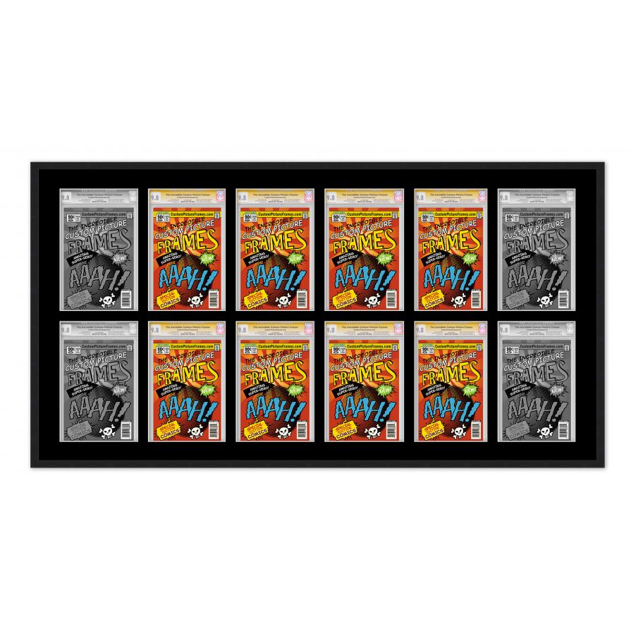 Share your comic collection by putting your comic books on display in a high-quality wood frame. Includes nesting foam to snuggly and securely hold your comic books in place. This frame features a black finish and your choice of black or white acid-free matting to display 12 graded comic books horizontally. Also included are a UV-resistant acrylic protective front, foam board backing, easel stand, and wall hanging hardware. This frame displays twelve CGC, CBCS or PGX graded comic books measuring 8.125x13 inches. This moulding is 0.75 inches wide. The overall dimensions of this frame are 54.5x31 inches. Includes nesting foam to snuggly and securely hold your comic books in place. This graded comic book frame for your CGC, CBCS or PGX graded comic books makes a great gift or addition to your home or office! Display your prized comic book collection in style with a handcrafted frame by Custom Picture Frames.