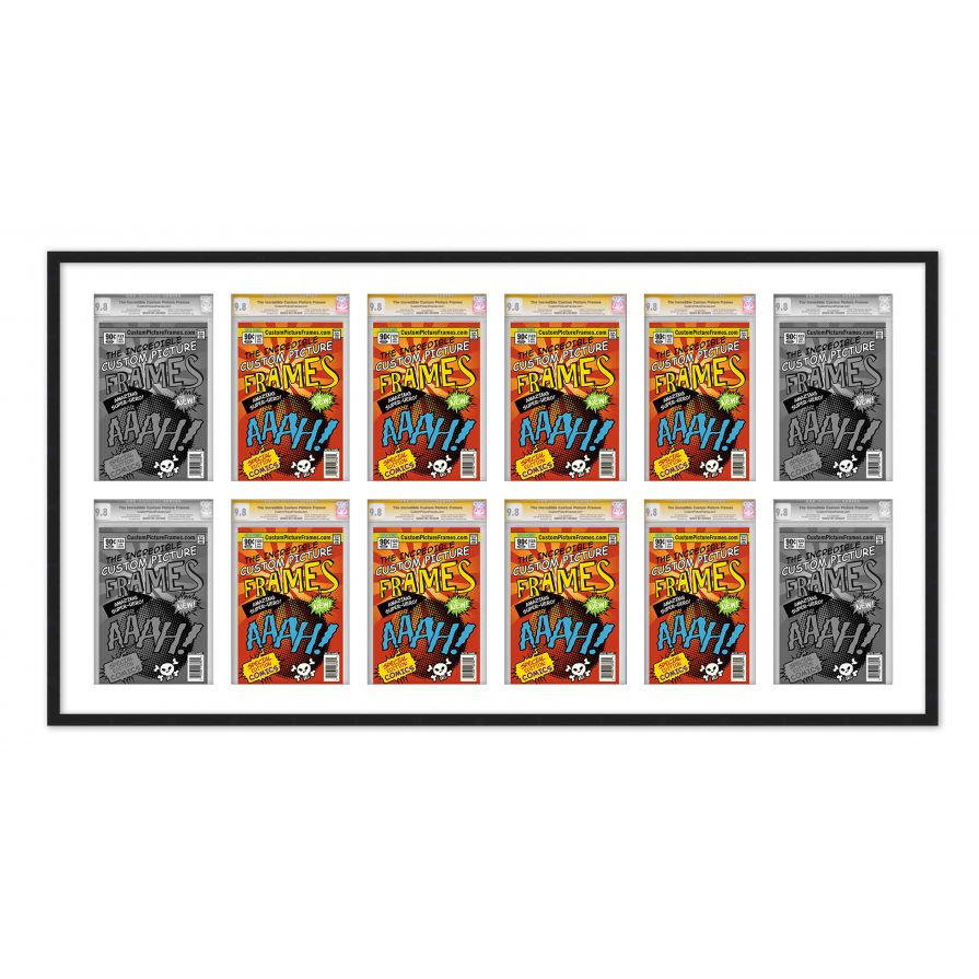 Share your comic collection by putting your comic books on display in a high-quality wood frame. Includes nesting foam to snuggly and securely hold your comic books in place. This frame features a black finish and your choice of black or white acid-free matting to display 12 graded comic books horizontally. Also included are a UV-resistant acrylic protective front, foam board backing, easel stand, and wall hanging hardware. This frame displays twelve CGC, CBCS or PGX graded comic books measuring 8.125x13 inches. This moulding is 0.75 inches wide. The overall dimensions of this frame are 54.5x31 inches. Includes nesting foam to snuggly and securely hold your comic books in place. This graded comic book frame for your CGC, CBCS or PGX graded comic books makes a great gift or addition to your home or office! Display your prized comic book collection in style with a handcrafted frame by Custom Picture Frames.