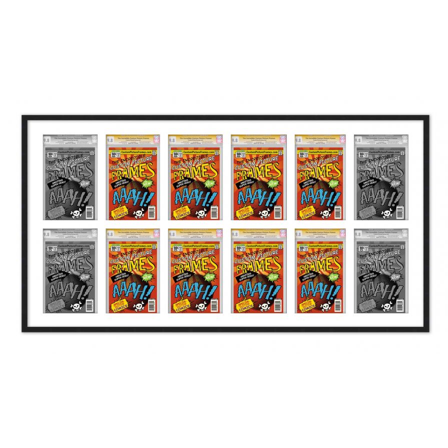 Share your comic collection by putting your comic books on display in a high-quality wood frame. Includes nesting foam to snuggly and securely hold your comic books in place. This frame features a black finish and your choice of black or white acid-free matting to display 12 graded comic books horizontally. Also included are a UV-resistant acrylic protective front, foam board backing, easel stand, and wall hanging hardware. This frame displays twelve CGC, CBCS or PGX graded comic books measuring 8.125x13 inches. This moulding is 0.75 inches wide. The overall dimensions of this frame are 54.5x31 inches. Includes nesting foam to snuggly and securely hold your comic books in place. This graded comic book frame for your CGC, CBCS or PGX graded comic books makes a great gift or addition to your home or office! Display your prized comic book collection in style with a handcrafted frame by Custom Picture Frames.
