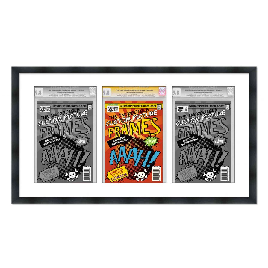 Share your comic collection by putting your comic books on display in a high-quality wood frame. Includes nesting foam to snuggly and securely hold your comic books in place. This frame features a black finish and your choice of black or white acid-free matting to display 3 graded comic books. Also included are a UV-resistant acrylic protective front, foam board backing, easel stand, and wall hanging hardware. This frame displays three CGC, CBCS or PGX graded comic books measuring 8.125x13 inches. This moulding is 0.75 inches wide. The overall dimensions of this frame are 31.75x18 inches. Includes nesting foam to snuggly and securely hold your comic books in place. This triple graded comic book frame for your CGC, CBCS or PGX graded comic books makes a great gift or addition to your home or office! Display your prized comic book collection in style with a handcrafted frame by Custom Picture Frames.