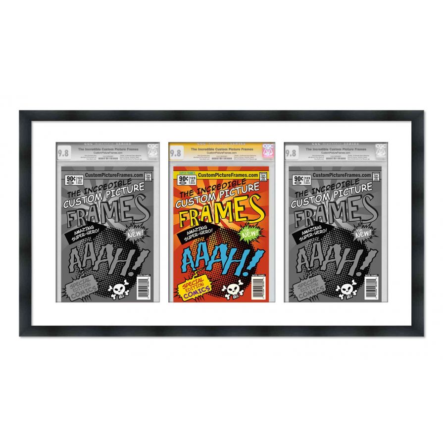 Share your comic collection by putting your comic books on display in a high-quality wood frame. Includes nesting foam to snuggly and securely hold your comic books in place. This frame features a black finish and your choice of black or white acid-free matting to display 3 graded comic books. Also included are a UV-resistant acrylic protective front, foam board backing, easel stand, and wall hanging hardware. This frame displays three CGC, CBCS or PGX graded comic books measuring 8.125x13 inches. This moulding is 0.75 inches wide. The overall dimensions of this frame are 31.75x18 inches. Includes nesting foam to snuggly and securely hold your comic books in place. This triple graded comic book frame for your CGC, CBCS or PGX graded comic books makes a great gift or addition to your home or office! Display your prized comic book collection in style with a handcrafted frame by Custom Picture Frames.