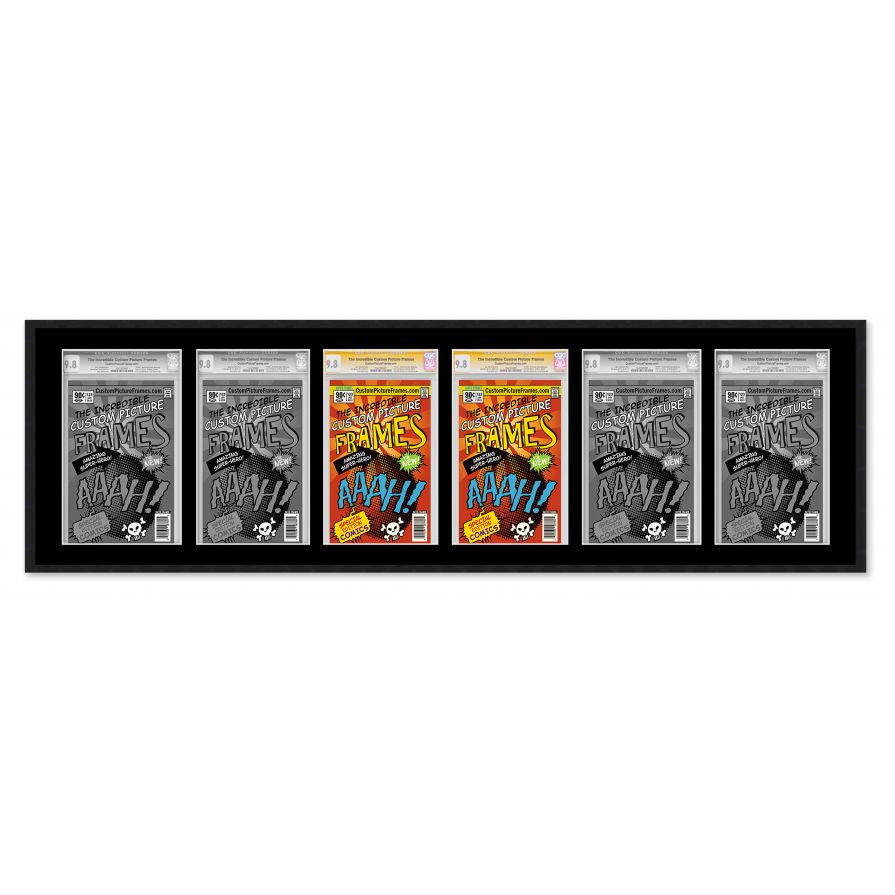 Share your comic collection by putting your comic books on display in a high-quality wood frame. Includes nesting foam to snuggly and securely hold your comic books in place. This frame features a black finish and your choice of black or white acid-free matting to display 6 graded comic books horizontally. Also included are a UV-resistant acrylic protective front, foam board backing, easel stand, and wall hanging hardware. This frame displays six CGC, CBCS or PGX graded comic books measuring 8.125x13 inches. This moulding is 0.75 inches wide. The overall dimensions of this frame are 55.5x17.5 inches. Includes nesting foam to snuggly and securely hold your comic books in place. This graded comic book frame for your CGC, CBCS or PGX graded comic books makes a great gift or addition to your home or office! Display your prized comic book collection in style with a handcrafted frame by Custom Picture Frames.