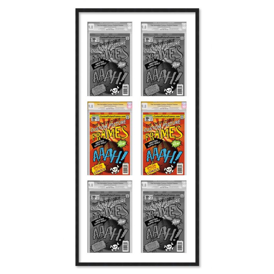Share your comic collection by putting your comic books on display in a high-quality wood frame. Includes nesting foam to snuggly and securely hold your comic books in place. This frame features a black finish and your choice of black or white acid-free matting to display 6 graded comic books vertically. Also included are a UV-resistant acrylic protective front, foam board backing, easel stand, and wall hanging hardware. This frame displays six CGC, CBCS or PGX graded comic books measuring 8.125x13 inches. This moulding is 0.75 inches wide. The overall dimensions of this frame are 22.25x46 inches. Includes nesting foam to snuggly and securely hold your comic books in place. This graded comic book frame for your CGC, CBCS or PGX graded comic books makes a great gift or addition to your home or office! Display your prized comic book collection in style with a handcrafted frame by Custom Picture Frames.