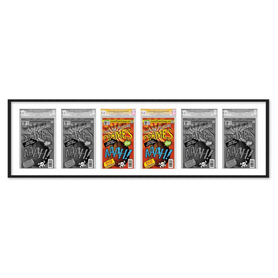 Share your comic collection by putting your comic books on display in a high-quality wood frame. Includes nesting foam to snuggly and securely hold your comic books in place. This frame features a black finish and your choice of black or white acid-free matting to display 6 graded comic books horizontally. Also included are a UV-resistant acrylic protective front, foam board backing, easel stand, and wall hanging hardware. This frame displays six CGC, CBCS or PGX graded comic books measuring 8.125x13 inches. This moulding is 0.75 inches wide. The overall dimensions of this frame are 55.5x17.5 inches. Includes nesting foam to snuggly and securely hold your comic books in place. This graded comic book frame for your CGC, CBCS or PGX graded comic books makes a great gift or addition to your home or office! Display your prized comic book collection in style with a handcrafted frame by Custom Picture Frames.