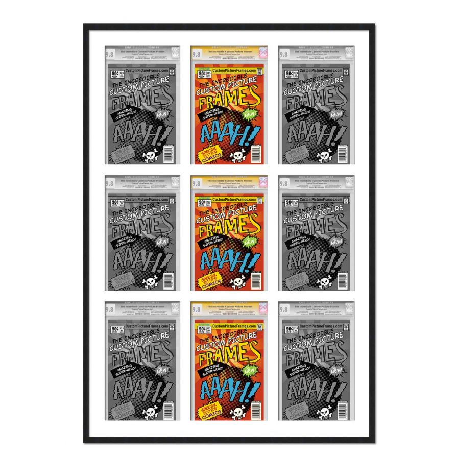 Share your comic collection by putting your comic books on display in a high-quality wood frame. Includes nesting foam to snuggly and securely hold your comic books in place. This frame features a black finish and your choice of black or white acid-free matting to display 9 graded comic books. Also included are a UV-resistant acrylic protective front, foam board backing, easel stand, and wall hanging hardware. This frame displays nine CGC, CBCS or PGX graded comic books measuring 8.125x13 inches. This moulding is 0.75 inches wide. The overall dimensions of this frame are 31.5x46 inches. Includes nesting foam to snuggly and securely hold your comic books in place. This graded comic book frame for your CGC, CBCS or PGX graded comic books makes a great gift or addition to your home or office! Display your prized comic book collection in style with a handcrafted frame by Custom Picture Frames.