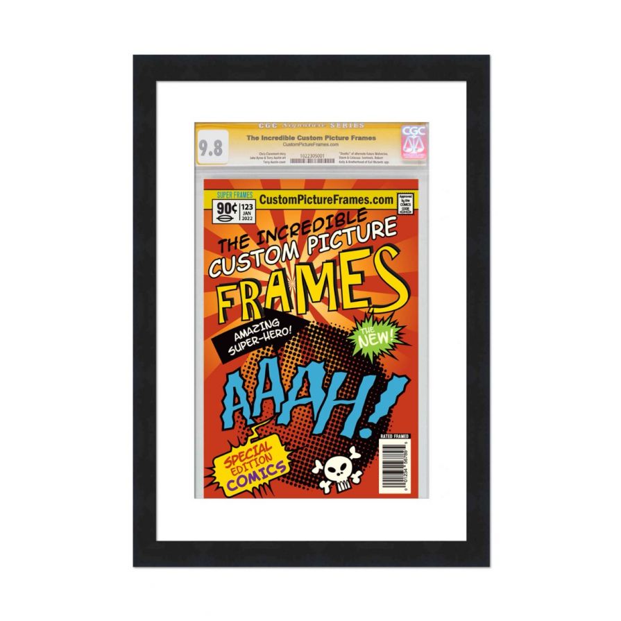Share your comic collection by putting your comic books on display in a high-quality wood frame.This frame features a black finish and your choice of black or white acid-free matting to fit your graded comic book. Also included are a UV-resistant acrylic protective front, foam board backing, easel stand, and wall hanging hardware. This frame displays 1 CGC, CBCS or PGX graded comic book measuring 8.125x13 inches. This moulding is 0.75 inches wide. The overall dimensions of this frame are 13.5"x18.5" inches. Includes nesting foam to snuggly and securely hold your comic books in place. This single graded comic book frame for your CGC, CBCS or PGX graded comic books makes a great gift or addition to your home or office! Display your prized comic book collection in style with a handcrafted frame by Custom Picture Frames.