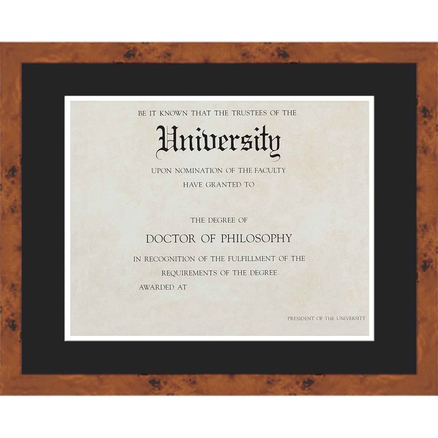 This frame features a brown burl wood finish and black on white acid-free double mat and includes a UV resistant acrylic protective front, foam board backing and wall hanging hardware. We offer a variety of custom frames that fit a diploma, degree or certificate measuring: 8.5x11, 11x14, 7.5x9.5, 12x15 and 11.75x16 with the mats or 11x14, 15x18, 11.5x13.5, 16x19 and 15.75x20 without the mats.