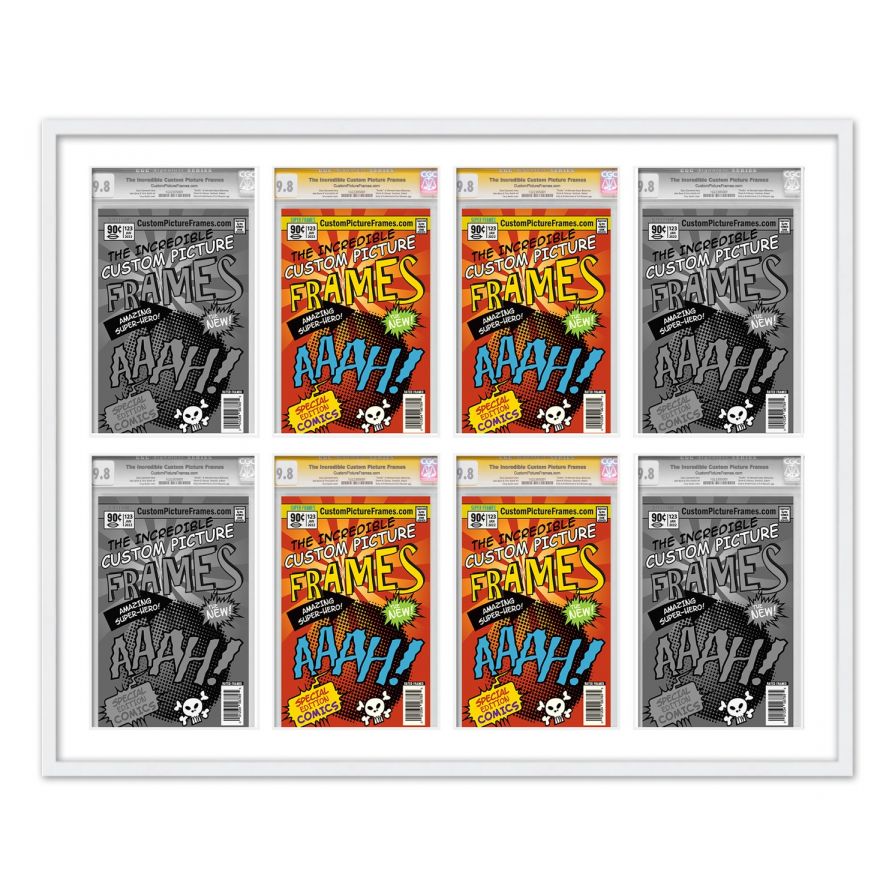 Share your comic collection by putting your comic books on display in a high-quality wood frame. Includes nesting foam to snuggly and securely hold your comic books in place. This frame features a white finish and your choice of black or white acid-free matting to display 8 graded comic books horizontally. Also included are a UV-resistant acrylic protective front, foam board backing, easel stand, and wall hanging hardware. This frame displays eight CGC, CBCS or PGX graded comic books measuring 8.125x13 inches. This moulding is 0.75 inches wide. The overall dimensions of this frame are 40.5x32 inches. Includes nesting foam to snuggly and securely hold your comic books in place. This graded comic book frame for your CGC, CBCS or PGX graded comic books makes a great gift or addition to your home or office! Display your prized comic book collection in style with a handcrafted frame by Custom Picture Frames.