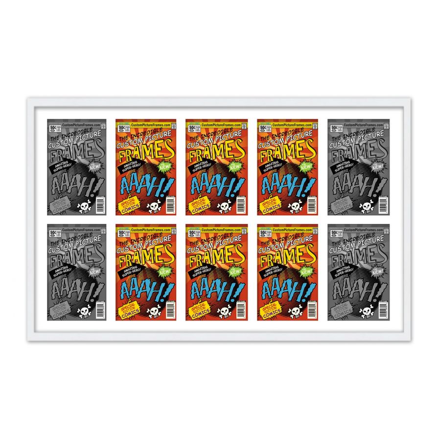 Share your comic collection by putting your comic books on display in a high-quality wood frame. Includes nesting foam to snuggly and securely hold your comic books in place. This frame features a white finish and your choice of black or white acid-free matting to display 10 comic books horizontally. Also included are a UV-resistant acrylic protective front, foam board backing, easel stand, and wall hanging hardware. This frame displays ten Bronze Age (Published Between 1970 and 1985) comic books measuring 7.25x10.5 inches, Golden Age (Published Between 1938 and 1956) comic books measuring 7.75x10.5 inches, Silver Age (Published Between 1956 and 1970) comic books measuring 7.125x10.5 inches or Current Era (Published After 1985) comic books measuring 6.875x10.5 inches. This moulding is 0.75 inches wide. The overall dimensions of this frame are 45.5x26.25 inches. Includes nesting foam to snuggly and securely hold your comic books in place. This comic book frame for your Bronze, Golden, Silver or Current comic books makes a great gift or addition to your home or office! Display your prized comic book collection in style with a handcrafted frame by Custom Picture Frames.