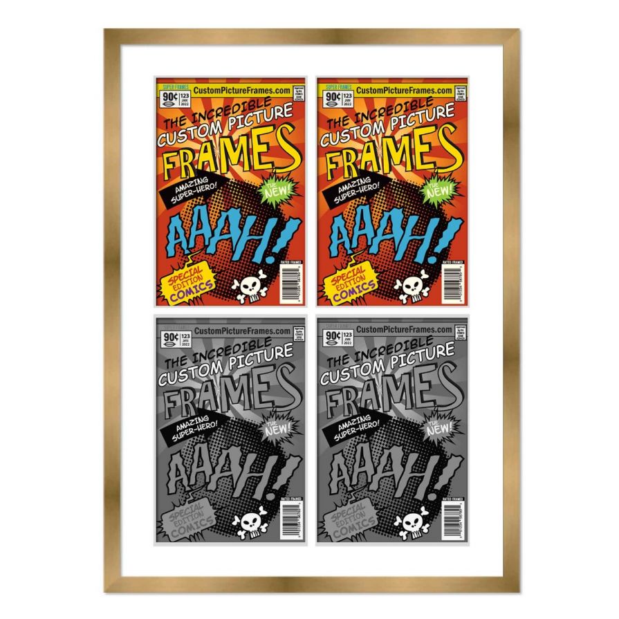 Share your comic collection by putting your comic books on display in a high-quality wood frame. Includes nesting foam to snuggly and securely hold your comic books in place. This frame features a gold finish and your choice of black or white acid-free matting to display 4 comic books in a 2x2 grid collage. Also included are a UV-resistant acrylic protective front, foam board backing, easel stand, and wall hanging hardware. This frame displays four Bronze Age (Published Between 1970 and 1985) comic books measuring 7.25x10.5 inches, Golden Age (Published Between 1938 and 1956) comic books measuring 7.75x10.5 inches, Silver Age (Published Between 1956 and 1970) comic books measuring 7.125x10.5 inches or Current Era (Published After 1985) comic books measuring 6.875x10.5 inches. This moulding is 0.75 inches wide. The overall dimensions of this frame are 21.5x27 inches. Includes nesting foam to snuggly and securely hold your comic books in place. This comic book frame for your Bronze, Golden, Silver or Current comic books makes a great gift or addition to your home or office! Display your prized comic book collection in style with a handcrafted frame by Custom Picture Frames.