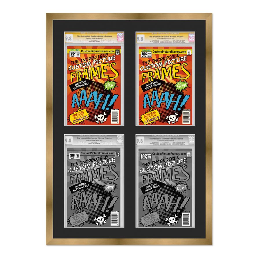 Share your comic collection by putting your comic books on display in a high-quality wood frame. Includes nesting foam to snuggly and securely hold your comic books in place. This frame features a gold finish and your choice of black or white acid-free matting to display 4 graded comic books in a 2x2 grid collage. Also included are a UV-resistant acrylic protective front, foam board backing, easel stand, and wall hanging hardware. This frame displays four CGC, CBCS or PGX graded comic books measuring 8.125x13 inches. This moulding is 0.75 inches wide. The overall dimensions of this frame are 22.25x32 inches. Includes nesting foam to snuggly and securely hold your comic books in place. This graded comic book frame for your CGC, CBCS or PGX graded comic books makes a great gift or addition to your home or office! Display your prized comic book collection in style with a handcrafted frame by Custom Picture Frames.