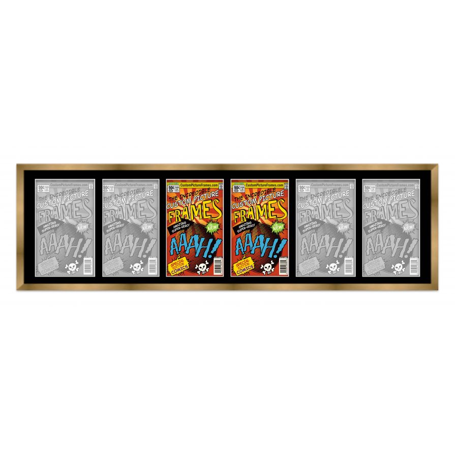 Share your comic collection by putting your comic books on display in a high-quality wood frame. Includes nesting foam to snuggly and securely hold your comic books in place. This frame features a gold finish and your choice of black or white acid-free matting to display 6 comic books. Also included are a UV-resistant acrylic protective front, foam board backing, easel stand, and wall hanging hardware. This frame displays six Bronze Age (Published Between 1970 and 1985) comic books measuring 7.25x10.5 inches, Golden Age (Published Between 1938 and 1956) comic books measuring 7.75x10.5 inches, Silver Age (Published Between 1956 and 1970) comic books measuring 7.125x10.5 inches or Current Era (Published After 1985) comic books measuring 6.875x10.5 inches. This moulding is 0.75 inches wide. The overall dimensions of this frame are 52.5x15.5 inches. Includes nesting foam to snuggly and securely hold your comic books in place. This comic book frame for your Bronze, Golden, Silver or Current comic books makes a great gift or addition to your home or office! Display your prized comic book collection in style with a handcrafted frame by Custom Picture Frames.
