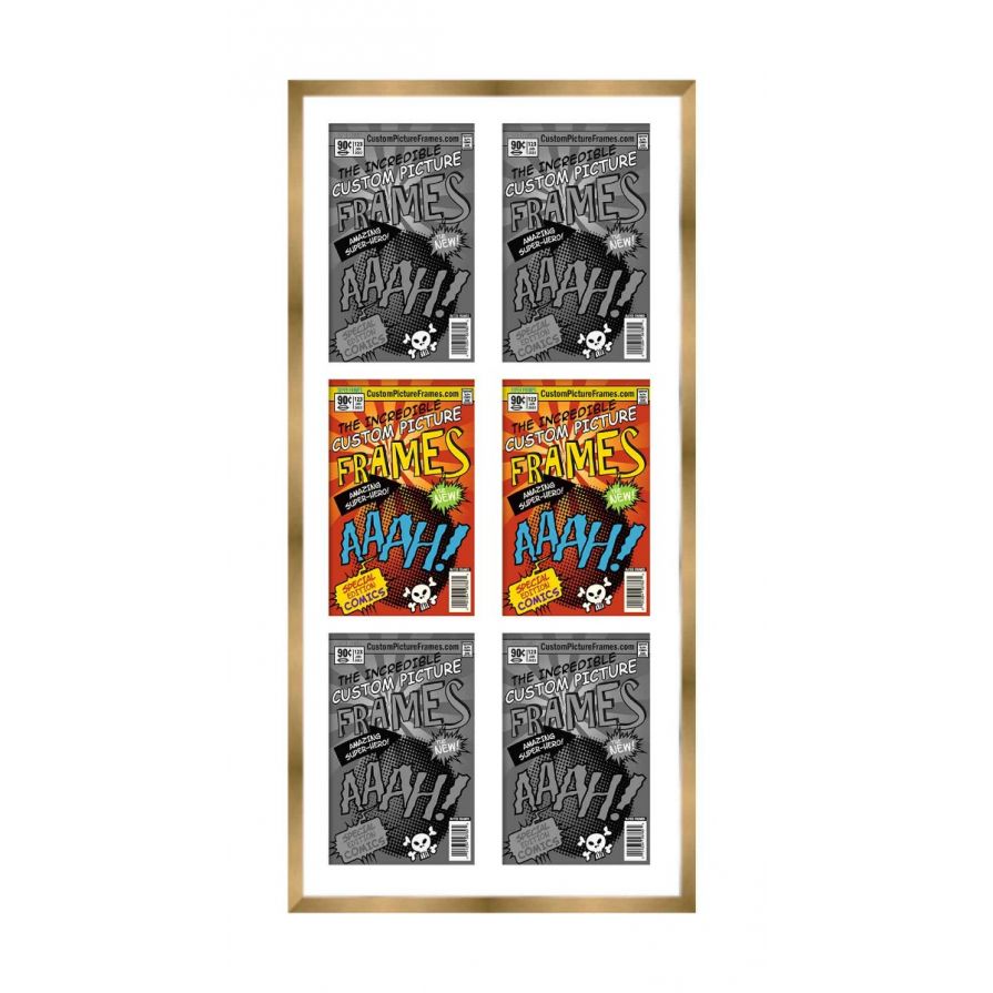 Share your comic collection by putting your comic books on display in a high-quality wood frame. Includes nesting foam to snuggly and securely hold your comic books in place. This frame features a gold finish and your choice of black or white acid-free matting to display 6 comic books vertically. Also included are a UV-resistant acrylic protective front, foam board backing, easel stand, and wall hanging hardware. This frame displays six Bronze Age (Published Between 1970 and 1985) comic books measuring 7.25x10.5 inches, Golden Age (Published Between 1938 and 1956) comic books measuring 7.75x10.5 inches, Silver Age (Published Between 1956 and 1970) comic books measuring 7.125x10.5 inches or Current Era (Published After 1985) comic books measuring 6.875x10.5 inches. This moulding is 0.75 inches wide. The overall dimensions of this frame are 21.5x40 inches. Includes nesting foam to snuggly and securely hold your comic books in place. This comic book frame for your Bronze, Golden, Silver or Current comic books makes a great gift or addition to your home or office! Display your prized comic book collection in style with a handcrafted frame by Custom Picture Frames.