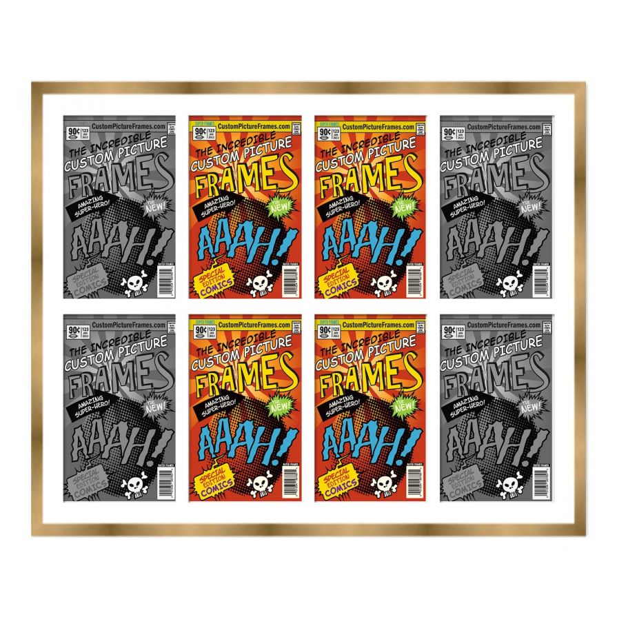Share your comic collection by putting your comic books on display in a high-quality wood frame. Includes nesting foam to snuggly and securely hold your comic books in place. This frame features a gold finish and your choice of black or white acid-free matting to display 8 comic books horizontally. Also included are a UV-resistant acrylic protective front, foam board backing, easel stand, and wall hanging hardware. This frame displays eight Bronze Age (Published Between 1970 and 1985) comic books measuring 7.25x10.5 inches, Golden Age (Published Between 1938 and 1956) comic books measuring 7.75x10.5 inches, Silver Age (Published Between 1956 and 1970) comic books measuring 7.125x10.5 inches or Current Era (Published After 1985) comic books measuring 6.875x10.5 inches. This moulding is 0.75 inches wide. The overall dimensions of this frame are 39x28 inches. Includes nesting foam to snuggly and securely hold your comic books in place. This comic book frame for your Bronze, Golden, Silver or Current comic books makes a great gift or addition to your home or office! Display your prized comic book collection in style with a handcrafted frame by Custom Picture Frames.