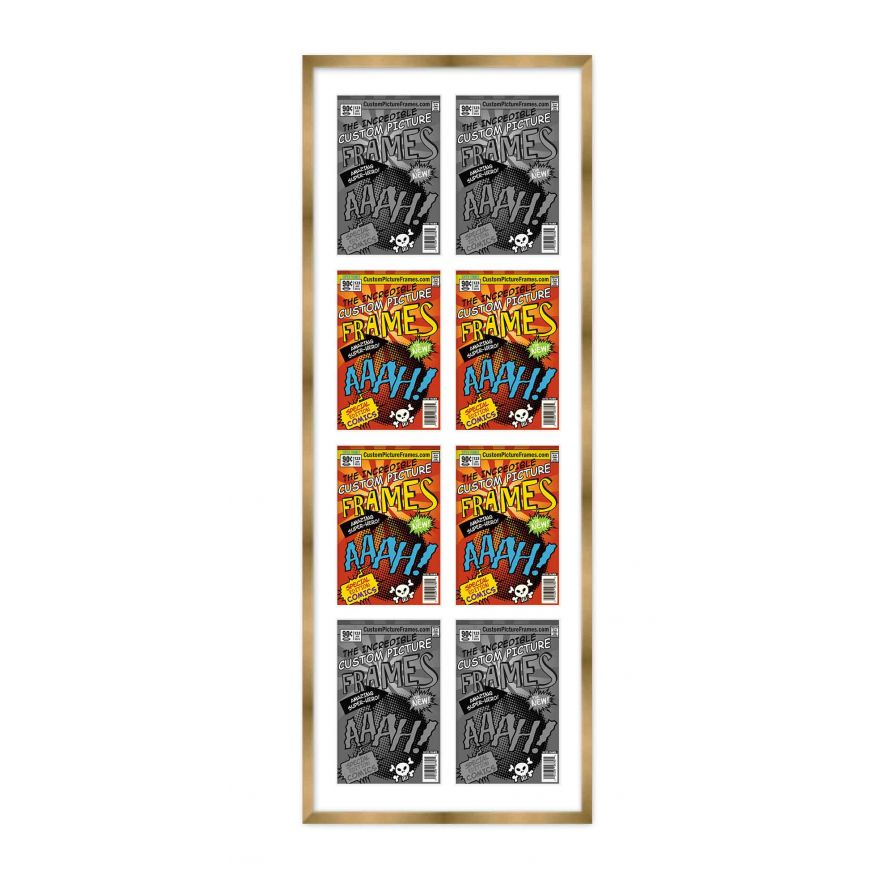 Share your comic collection by putting your comic books on display in a high-quality wood frame. Includes nesting foam to snuggly and securely hold your comic books in place. This frame features a gold finish and your choice of black or white acid-free matting to display 8 comic books vertically. Also included are a UV-resistant acrylic protective front, foam board backing, easel stand, and wall hanging hardware. This frame displays eight Bronze Age (Published Between 1970 and 1985) comic books measuring 7.25x10.5 inches, Golden Age (Published Between 1938 and 1956) comic books measuring 7.75x10.5 inches, Silver Age (Published Between 1956 and 1970) comic books measuring 7.125x10.5 inches or Current Era (Published After 1985) comic books measuring 6.875x10.5 inches. This moulding is 0.75 inches wide. The overall dimensions of this frame are 21.5x52 inches. Includes nesting foam to snuggly and securely hold your comic books in place. This comic book frame for your Bronze, Golden, Silver or Current comic books makes a great gift or addition to your home or office! Display your prized comic book collection in style with a handcrafted frame by Custom Picture Frames.