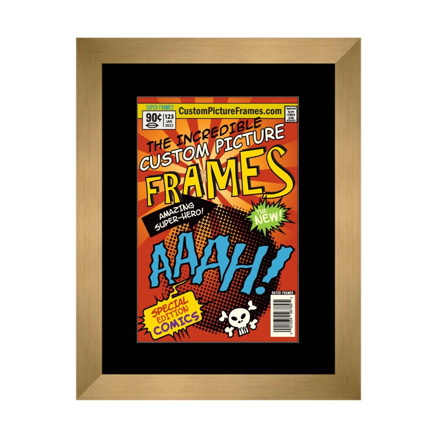 Share your comic collection by putting your comic books on display in a high-quality wood frame.This frame features a gold finish and your choice of black or white acid-free matting to display 2 comic books. Also included are a UV-resistant acrylic protective front, foam board backing, easel stand, and wall hanging hardware. This frame displays two Bronze Age (Published Between 1970 and 1985) comic books measuring 7.25x10.5 inches, Golden Age (Published Between 1938 and 1956) comic books measuring 7.75x10.5 inches, Silver Age (Published Between 1956 and 1970) comic books measuring 7.125x10.5 inches or Current Era (Published After 1985) comic books measuring 6.875x10.5 inches. This moulding is 0.75 inches wide. The overall dimensions of this frame are 15.5x19.5 inches. Includes nesting foam to snuggly and securely hold your comic books in place. This double comic book frame for your Bronze, Golden, Silver or Current comic books makes a great gift or addition to your home or office! Display your prized comic book collection in style with a handcrafted frame by Custom Picture Frames.