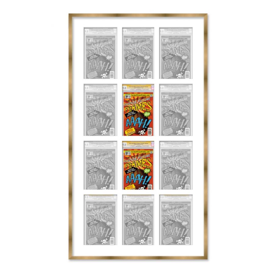 Share your comic collection by putting your comic books on display in a high-quality wood frame. Includes nesting foam to snuggly and securely hold your comic books in place. This frame features a gold finish and your choice of black or white acid-free matting to display 12 graded comic books. Also included are a UV-resistant acrylic protective front, foam board backing, easel stand, and wall hanging hardware. This frame displays twelve CGC, CBCS or PGX graded comic books measuring 8.125x13 inches. This moulding is 0.75 inches wide. The overall dimensions of this frame are 31.5x60 inches. Includes nesting foam to snuggly and securely hold your comic books in place. This graded comic book frame for your CGC, CBCS or PGX graded comic books makes a great gift or addition to your home or office! Display your prized comic book collection in style with a handcrafted frame by Custom Picture Frames.