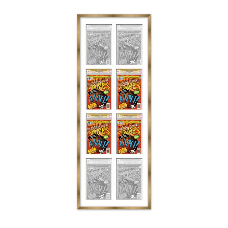 Share your comic collection by putting your comic books on display in a high-quality wood frame. Includes nesting foam to snuggly and securely hold your comic books in place. This frame features a gold finish and your choice of black or white acid-free matting to display 8 graded comic books vertically. Also included are a UV-resistant acrylic protective front, foam board backing, easel stand, and wall hanging hardware. This frame displays eight CGC, CBCS or PGX graded comic books measuring 8.125x13 inches. This moulding is 0.75 inches wide. The overall dimensions of this frame are 22.5x60 inches. Includes nesting foam to snuggly and securely hold your comic books in place. This graded comic book frame for your CGC, CBCS or PGX graded comic books makes a great gift or addition to your home or office! Display your prized comic book collection in style with a handcrafted frame by Custom Picture Frames.