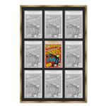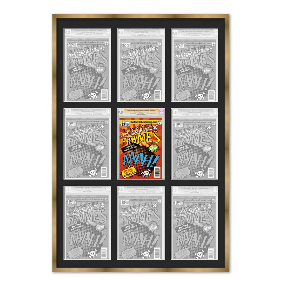 Share your comic collection by putting your comic books on display in a high-quality wood frame. Includes nesting foam to snuggly and securely hold your comic books in place. This frame features a gold finish and your choice of black or white acid-free matting to display 9 graded comic books. Also included are a UV-resistant acrylic protective front, foam board backing, easel stand, and wall hanging hardware. This frame displays nine CGC, CBCS or PGX graded comic books measuring 8.125x13 inches. This moulding is 0.75 inches wide. The overall dimensions of this frame are 31.5x46 inches. Includes nesting foam to snuggly and securely hold your comic books in place. This graded comic book frame for your CGC, CBCS or PGX graded comic books makes a great gift or addition to your home or office! Display your prized comic book collection in style with a handcrafted frame by Custom Picture Frames.