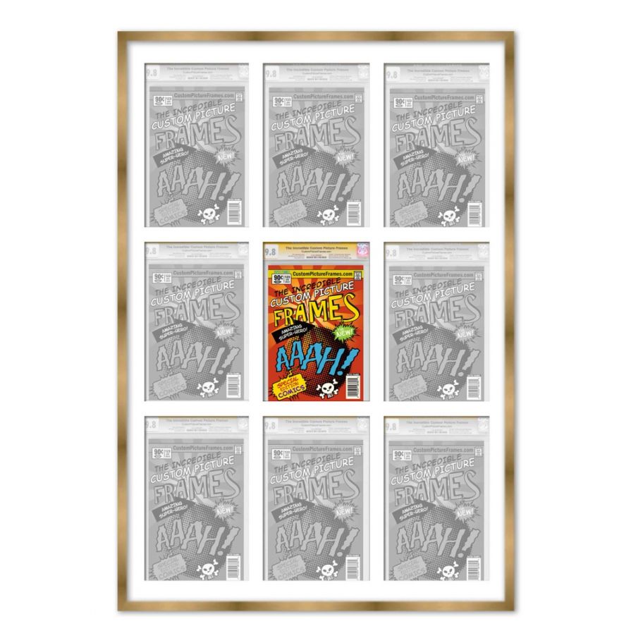 Share your comic collection by putting your comic books on display in a high-quality wood frame. Includes nesting foam to snuggly and securely hold your comic books in place. This frame features a gold finish and your choice of black or white acid-free matting to display 9 graded comic books. Also included are a UV-resistant acrylic protective front, foam board backing, easel stand, and wall hanging hardware. This frame displays nine CGC, CBCS or PGX graded comic books measuring 8.125x13 inches. This moulding is 0.75 inches wide. The overall dimensions of this frame are 31.5x46 inches. Includes nesting foam to snuggly and securely hold your comic books in place. This graded comic book frame for your CGC, CBCS or PGX graded comic books makes a great gift or addition to your home or office! Display your prized comic book collection in style with a handcrafted frame by Custom Picture Frames.