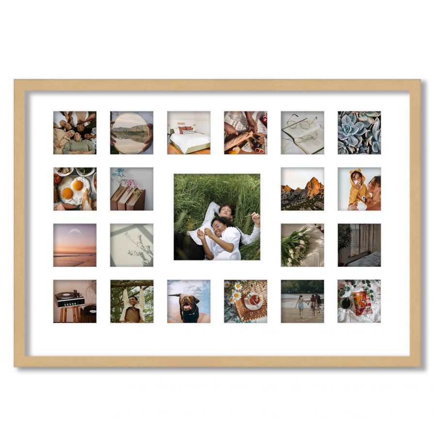 Our square matted picture frames feature a sleek, natural finish and smooth white mat for 4x4 photos. They're the perfect frame to display your Instagram grid on your wall. These 4x4 matted Instagram frames come in a variety of openings. You can choose from 1 photo, 4 photos, 9 photos, 21 photos, 25 photos or 63 photos to display your whole feed!