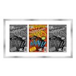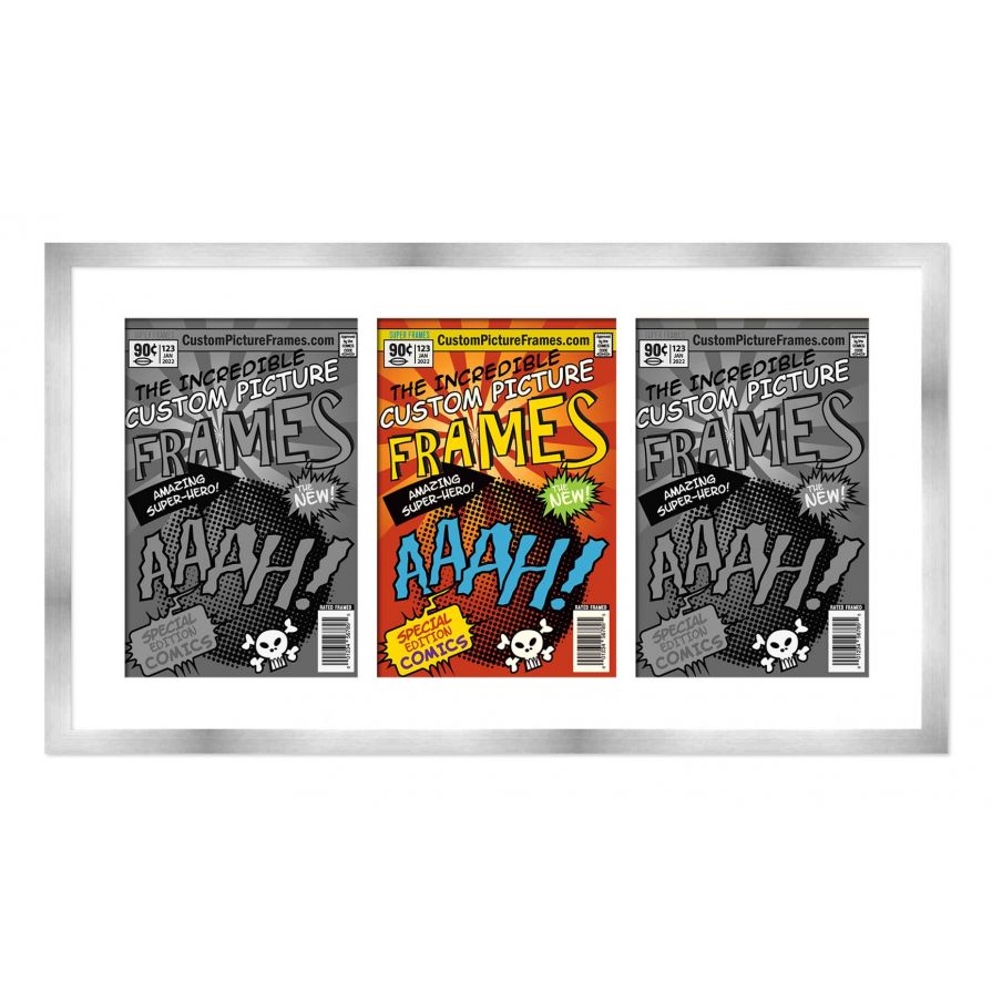 Share your comic collection by putting your comic books on display in a high-quality wood frame. Includes nesting foam to snuggly and securely hold your comic books in place. This frame features a silver finish and your choice of black or white acid-free matting to display 3 comic books. Also included are a UV-resistant acrylic protective front, foam board backing, easel stand, and wall hanging hardware. This frame displays three Bronze Age (Published Between 1970 and 1985) comic books measuring 7.25x10.5 inches, Golden Age (Published Between 1938 and 1956) comic books measuring 7.75x10.5 inches, Silver Age (Published Between 1956 and 1970) comic books measuring 7.125x10.5 inches or Current Era (Published After 1985) comic books measuring 6.875x10.5 inches. This moulding is 0.75 inches wide. The overall dimensions of this frame are 30.25x15.5 inches. Includes nesting foam to snuggly and securely hold your comic books in place. This triple comic book frame for your Bronze, Golden, Silver or Current comic books makes a great gift or addition to your home or office! Display your prized comic book collection in style with a handcrafted frame by Custom Picture Frames.