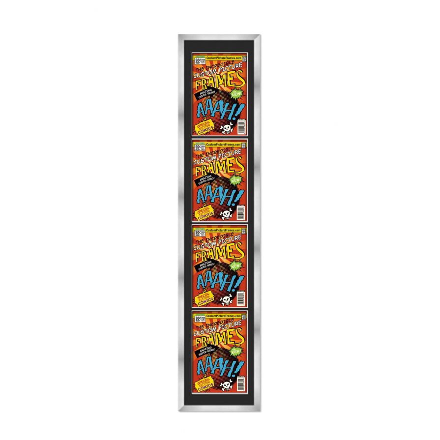 Share your comic collection by putting your comic books on display in a high-quality wood frame. Includes nesting foam to snuggly and securely hold your comic books in place. This frame features a silver finish and your choice of black or white acid-free matting to display 4 comic books vertically. Also included are a UV-resistant acrylic protective front, foam board backing, easel stand, and wall hanging hardware. This frame displays four Bronze Age (Published Between 1970 and 1985) comic books measuring 7.25x10.5 inches, Golden Age (Published Between 1938 and 1956) comic books measuring 7.75x10.5 inches, Silver Age (Published Between 1956 and 1970) comic books measuring 7.125x10.5 inches or Current Era (Published After 1985) comic books measuring 6.875x10.5 inches. This moulding is 0.75 inches wide. The overall dimensions of this frame are 12.75x48.5 inches. Includes nesting foam to snuggly and securely hold your comic books in place. This comic book frame for your Bronze, Golden, Silver or Current comic books makes a great gift or addition to your home or office! Display your prized comic book collection in style with a handcrafted frame by Custom Picture Frames.
