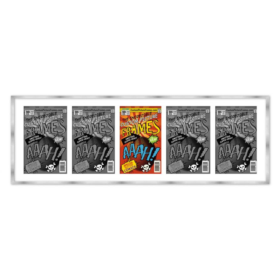 Share your comic collection by putting your comic books on display in a high-quality wood frame. Includes nesting foam to snuggly and securely hold your comic books in place. This frame features a silver finish and your choice of black or white acid-free matting to display 5 comic books. Also included are a UV-resistant acrylic protective front, foam board backing, easel stand, and wall hanging hardware. This frame displays five Bronze Age (Published Between 1970 and 1985) comic books measuring 7.25x10.5 inches, Golden Age (Published Between 1938 and 1956) comic books measuring 7.75x10.5 inches, Silver Age (Published Between 1956 and 1970) comic books measuring 7.125x10.5 inches or Current Era (Published After 1985) comic books measuring 6.875x10.5 inches. This moulding is 0.75 inches wide. The overall dimensions of this frame are 45.5x15.5 inches. Includes nesting foam to snuggly and securely hold your comic books in place. This comic book frame for your Bronze, Golden, Silver or Current comic books makes a great gift or addition to your home or office! Display your prized comic book collection in style with a handcrafted frame by Custom Picture Frames.