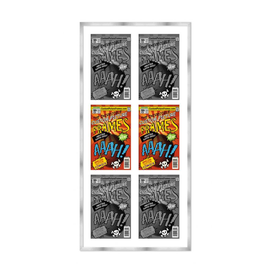 Share your comic collection by putting your comic books on display in a high-quality wood frame. Includes nesting foam to snuggly and securely hold your comic books in place. This frame features a silver finish and your choice of black or white acid-free matting to display 6 comic books vertically. Also included are a UV-resistant acrylic protective front, foam board backing, easel stand, and wall hanging hardware. This frame displays six Bronze Age (Published Between 1970 and 1985) comic books measuring 7.25x10.5 inches, Golden Age (Published Between 1938 and 1956) comic books measuring 7.75x10.5 inches, Silver Age (Published Between 1956 and 1970) comic books measuring 7.125x10.5 inches or Current Era (Published After 1985) comic books measuring 6.875x10.5 inches. This moulding is 0.75 inches wide. The overall dimensions of this frame are 21.5x40 inches. Includes nesting foam to snuggly and securely hold your comic books in place. This comic book frame for your Bronze, Golden, Silver or Current comic books makes a great gift or addition to your home or office! Display your prized comic book collection in style with a handcrafted frame by Custom Picture Frames.